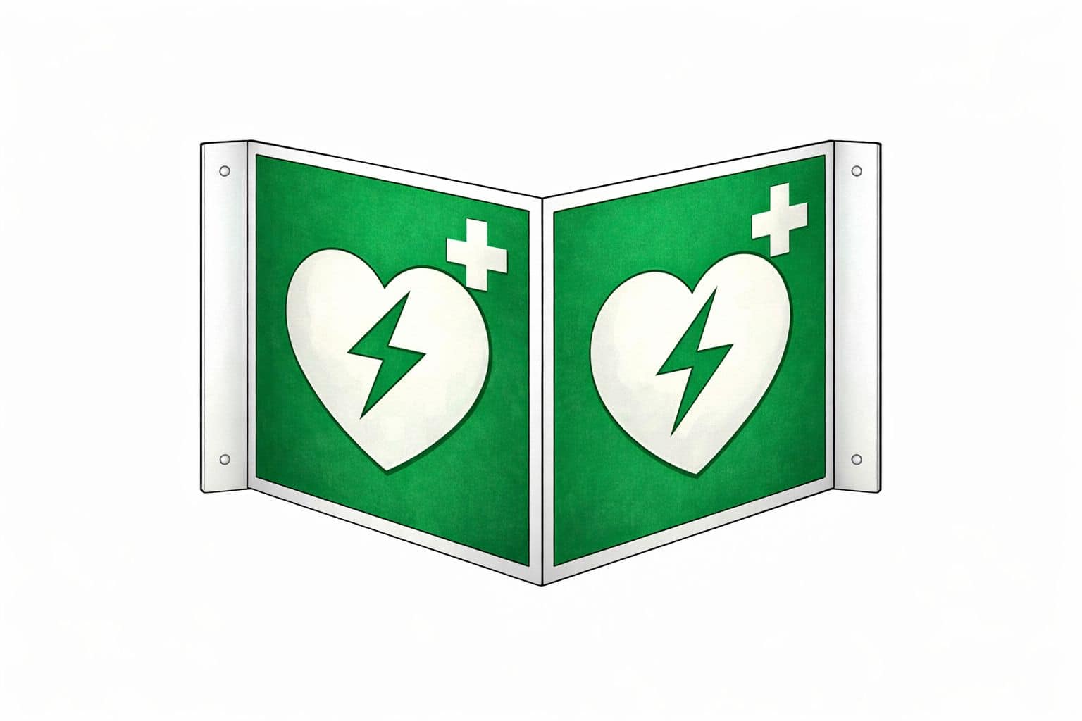 La sua forma triangolare come bandiera da parete offre un’eccellente visibilità multidirezionale, rendendo facile individuare il DAE anche a distanza o nei corridoi. Presenta il logo standardizzato del DAE in verde e bianco, con una superficie riflettente per una buona leggibilità in condizioni di scarsa illuminazione.